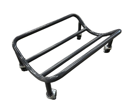 Förvaringsvagn för rullmattor, försedd med hjul för enkel transport.